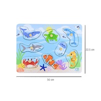 This peg puzzle features eight sea animals including whale, turtle, dolphin, shark, jellyfish, crab, fish and seahorse.