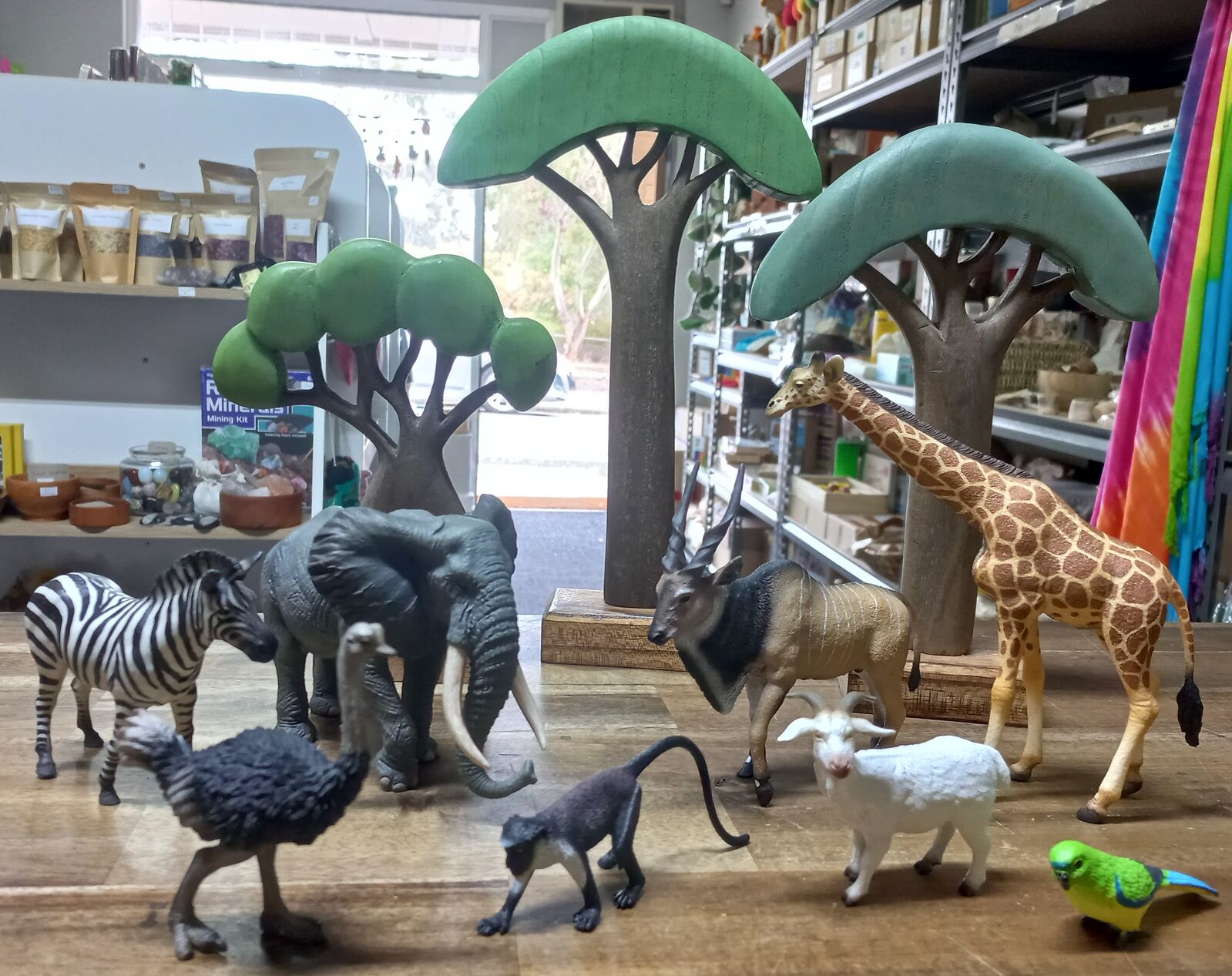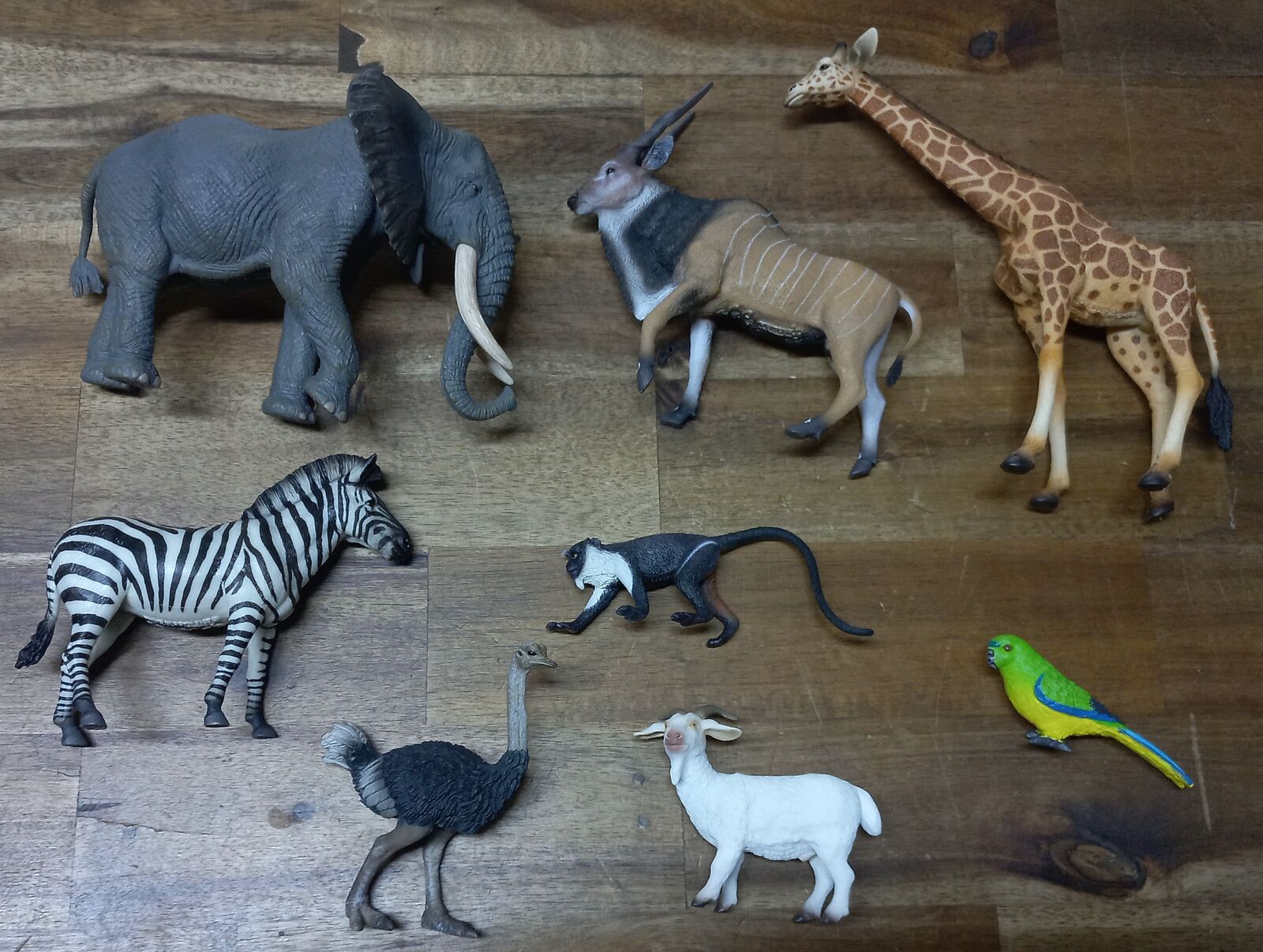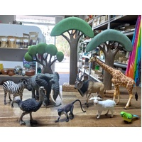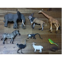 We have collected together a set of animal replicas including an elephant, giraffe, zebra, ostrich, antelope, monkey, goat & parrot