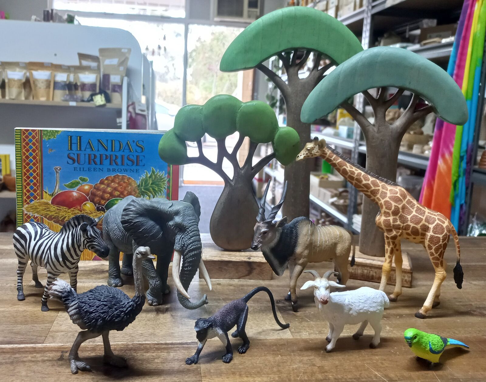 Bookish Play / Story Table idea - this set has similar animals to those found in the book Handa 's Surprise and so it can be used to retell the story or add some extra african animals to extend on!