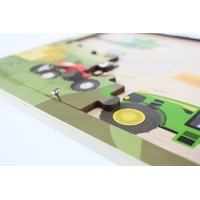 Each piece showcases iconic farm vehicles against a backdrop of rolling landscapes, offering a vivid glimpse into the agricultural heart of Australia. The puzzles large, easy to handle pieces are perfect for small hands, ensuring a satisfying and enjoyable experience for children as they piece together this engaging scene.