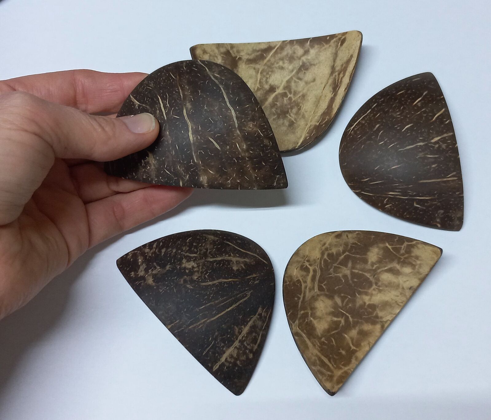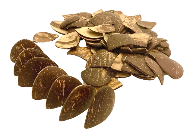 Cut from coconut shells, these 'chips' can stand up and be arranged in patterns, only to fall like a waterfall when the first one is pushed over.