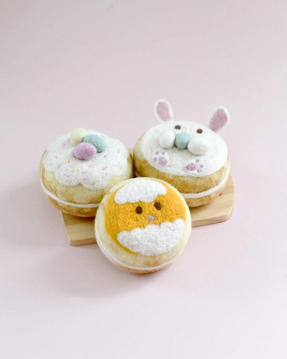 Step into a world of imaginative play with these adorable Easter-themed Doughnuts (Donuts). This set of 3 donuts consists of a Bunny, Chick Hatching and Pastel Eggs. Perfectly crafted for little hands and big imaginations, these felt treats bring endless joy and creativity to playtime.