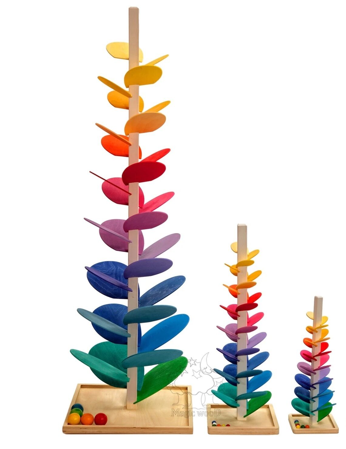 Children love to play with marble trees, watch the marbles run down, hear the tones of the leaves. The leaves give changing sounds from the top to the bottom of the tree. Elegant design and precise manufacturing provide a decorative touch to this item. Attractive also to grownups. It is so much more than a toy, but also an artwork for your home. With 30 different colors that will brighten up any room.