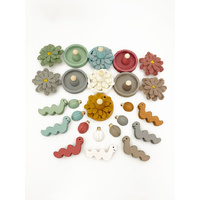 So many possibilities for Small World Play, Loose Part Play; this set has loads of interesting shapes and textures: felt Asters, hand painted Sumo people, hand painted worms, hand painted dishes and hand painted ladybirds, all in the same 7 colours of the Papoose Earth range.