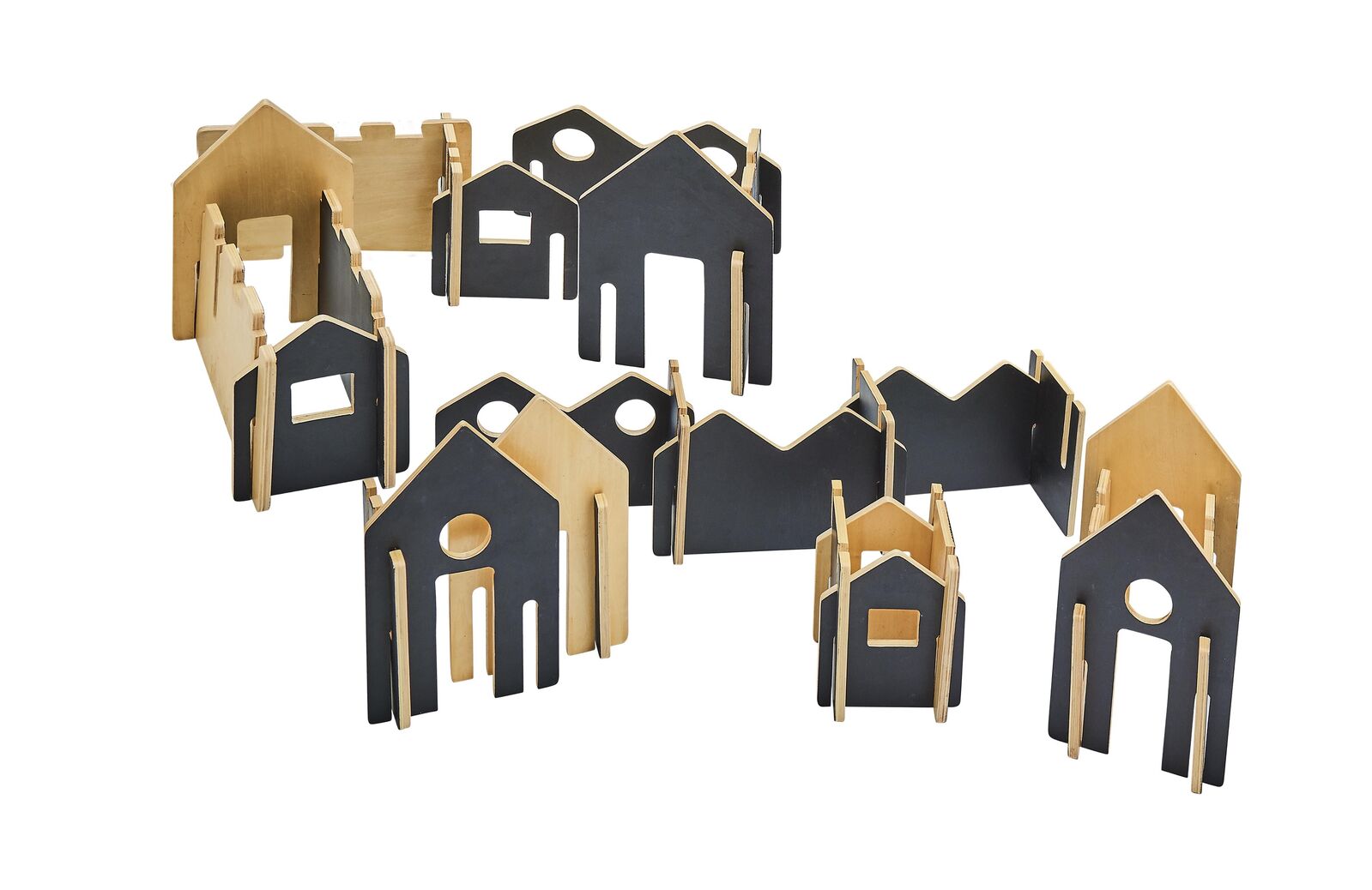 A durable activity play set with naturally finished wooden interlocking building silhouette shapes.