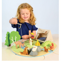 Scaled for the dollhouse world, this set takes our dollies on an adventurous journey into the wild! Set up camp near a picturesque mountain stream and watch as wild forest animals come to play. Essential camping gear includes a cozy sleeping bag, a lamp, a water bottle, and a fishing rod, along with the chance to build a small campfire for evening gatherings. A camping poster with real tips and advice for successful camping trips is also included, making it ideal for imaginative play and storytelling.